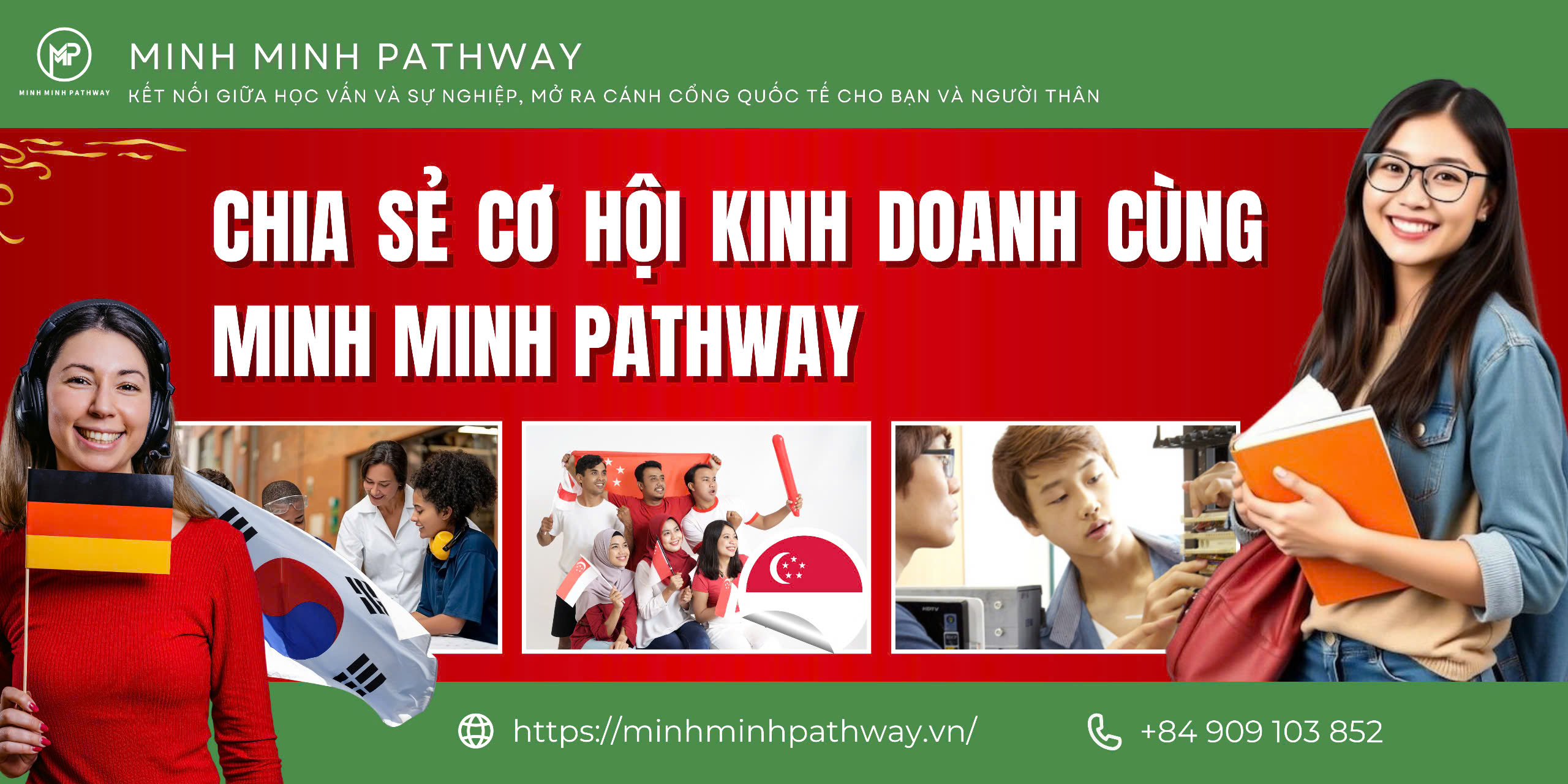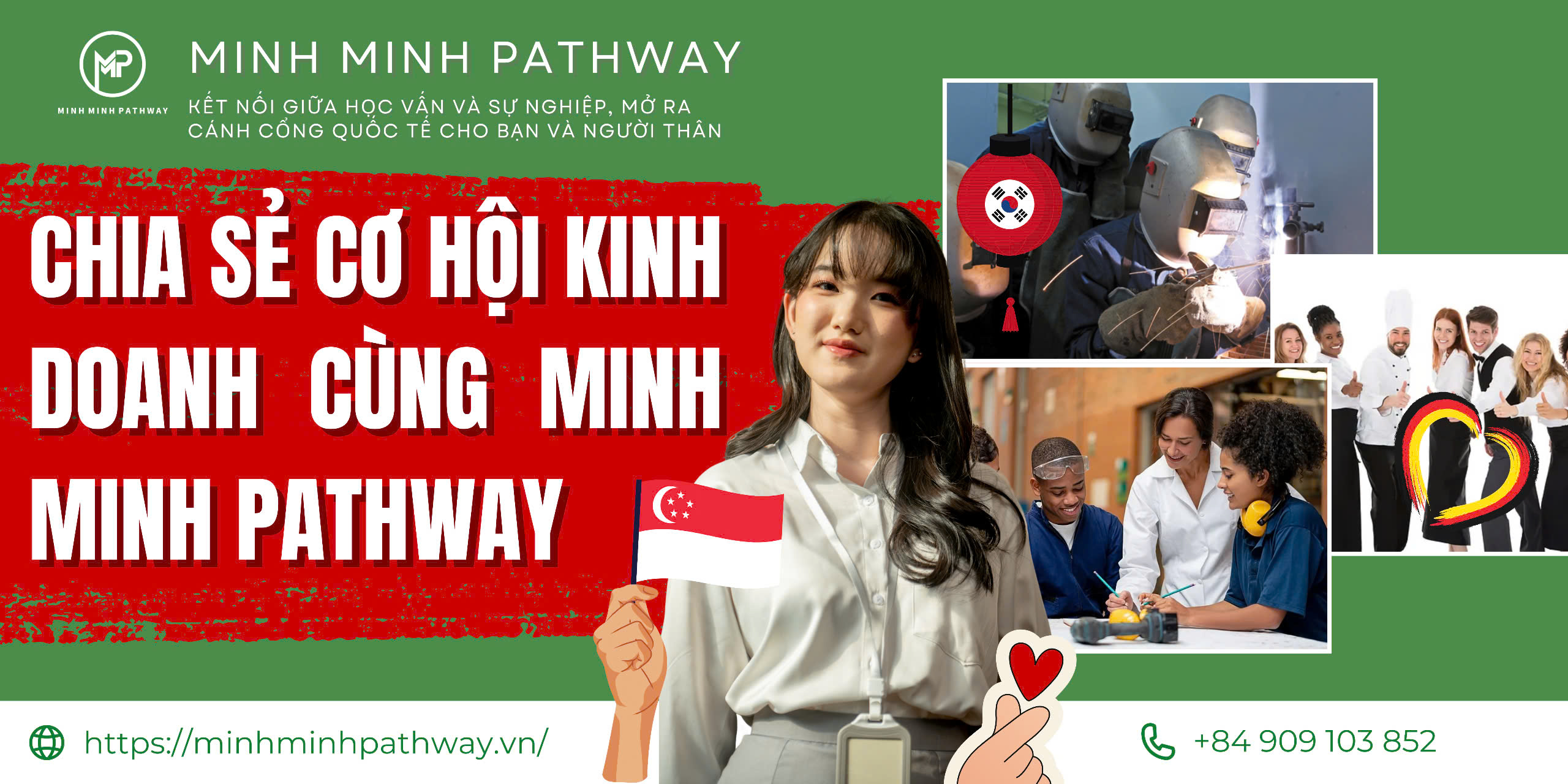 Minh Minh Pathway tự hào là đơn vị uy tín trong lĩnh vực du học nghề và xuất khẩu lao động tại Việt Nam. Với sứ mệnh kết nối học vấn và sự nghiệp, chúng tôi cam kết mang đến cho các bạn trẻ và các chủ cơ sở đào tạo những cơ hội học tập có lương và khả năng định cư sau du học. Hãy cùng chúng tôi xây dựng tương lai sáng lạn và mở ra cánh cửa quốc tế cho chính bạn!